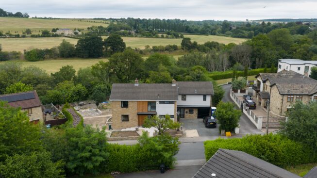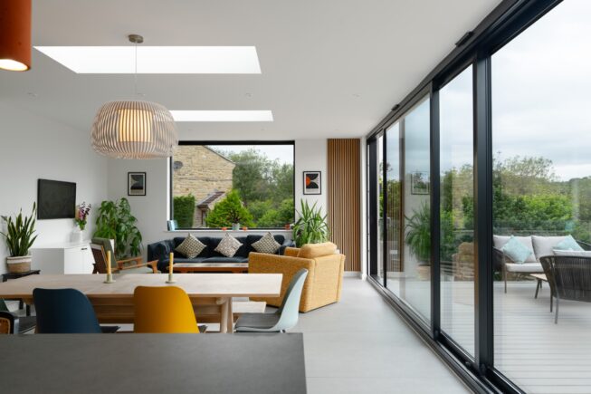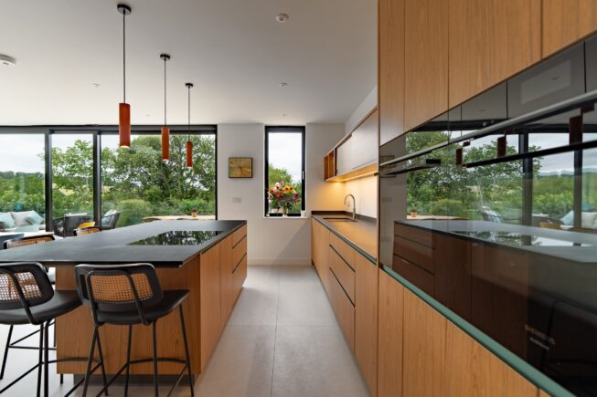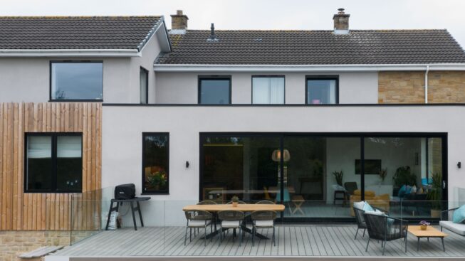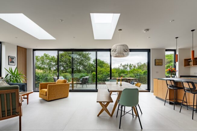 Our clients had a passion for mid-century design and shortly after purchasing this 1960’s house we were asked to help them remodel the internal layout and update the exterior. Externally, all of the windows have been replaced, an old porch and a small rear extension have been removed. The front of the house has been modernised with new timber cladding, we altered the position and size of the windows to the front and designed a large extension to the rear which opens out onto a large elevated outdoor terrace. A large open plan kitchen and dining space opens out onto the terrace, both spaces benefit from the views across the surrounding countryside.