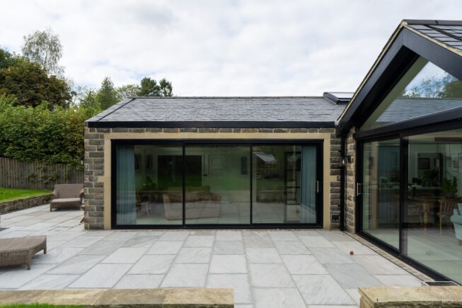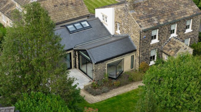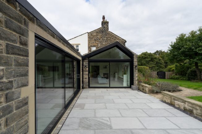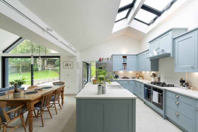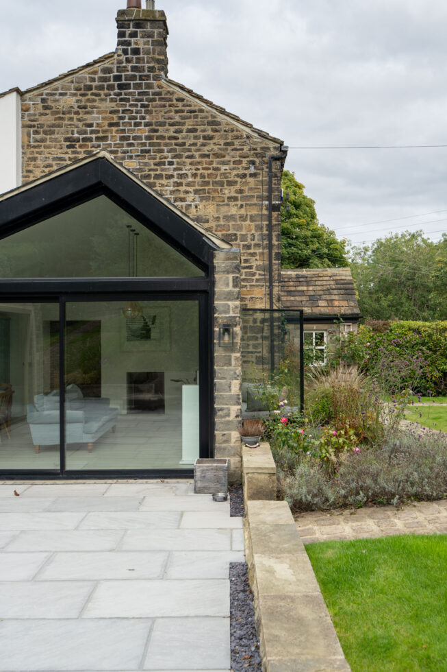 Natural light floods the new spaces through a central ridgelight above the kitchen and floor-to-ceiling glazing, creating a bright and welcoming atmosphere. Though contemporary in design, the extension is grounded in its setting: externally, new stonework has been tumbled and darkened to blend seamlessly with the original walls, while the roof is finished in natural slate to harmonize with both the cottage and the surrounding village.