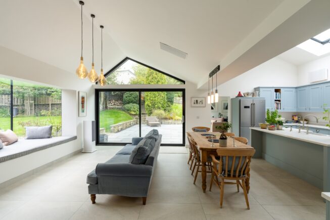 The original cottage has been carefully refurbished, preserving its character and most of its rooms, while the kitchen and dining area have been placed within a striking contemporary extension that opens directly to the garden. The extension’s unusual asymmetrical roofline reflects the form of the existing cottage, ensuring that original first-floor windows remain untouched while also creating a distinctive and dynamic interior. At the heart of the design is a bespoke frameless bay (oriel) window seat, achieved through structural glazing on a cantilevered base. Its asymmetrical form frames the view of a mature garden tree, offering a unique place to sit, relax, and enjoy the landscape.
